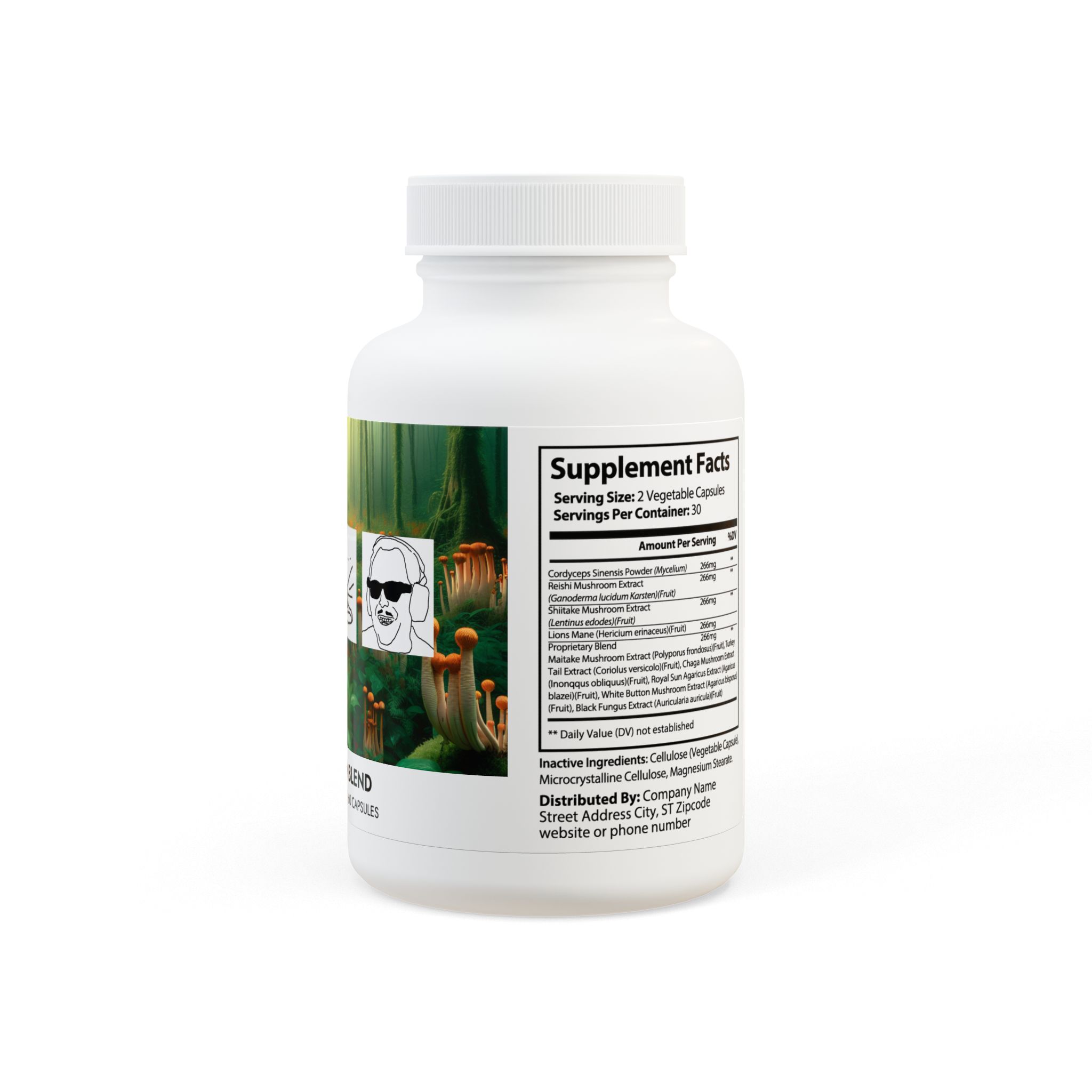 Ingredients: Cordyceps Sinensis Powder (Mycelium), Reishi Mushroom Extract, (Ganoderma lucidum Karsten)(Fruit), Shiitake Mushroom Extract, (Lentinus edodes)(Fruit), Lions Mane (Hericium erinaceus)(Fruit), Proprietary Blend, Maitake Mushroom Extract (Polyporus frondosus)(Fruit), Turkey Tail Extract (Coriolus versicolor)(Fruit), Chaga Mushroom Extract, (Inonqqus obliquus)(Fruit), Royal Sun Agaricus Extract (Agaricus blazei)(Fruit), White Button Mushroom Extract (Agaricus bisporus), (Fruit), Black Fungus Extract (Auricularia auricula)(Fruit), Cellulose (Vegetable Capsule), Microcrystalline Cellulose, Magnesium Stearate.
